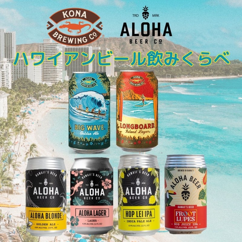 コナビールのビッグウェーブ・ロングボードに加え、アロハビールから日本初上陸したばかりの新商品アロハラガーほか人気のIPAやビッグウェーブと同じゴールデンエールスタイルのアロハブロンドと、各種1本ずつお楽しみいただけます。
